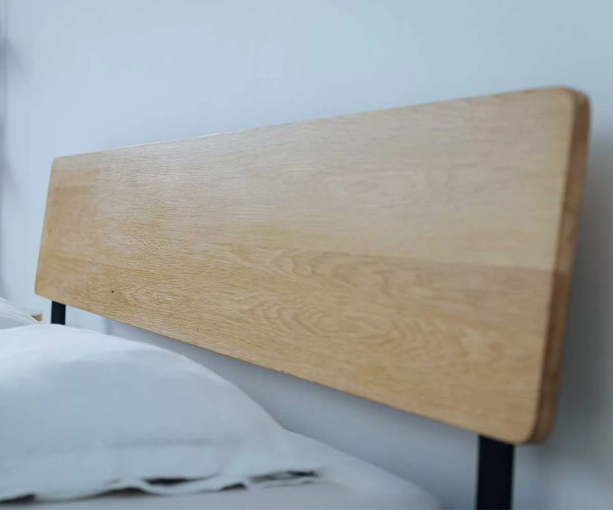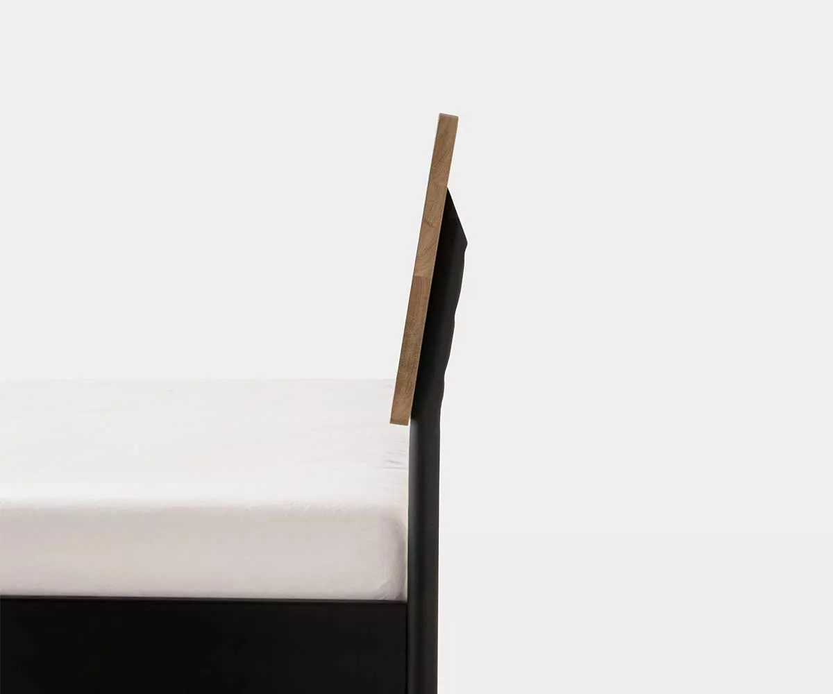 The rounded headboard made of fine oak wood gives the bed a warm and inviting appearance, while the gentle lines and round feet create a harmonious look that seamlessly integrates into any bedroom concept. The combination of robust metal and natural wood ensures that this bed is both timeless and modern.