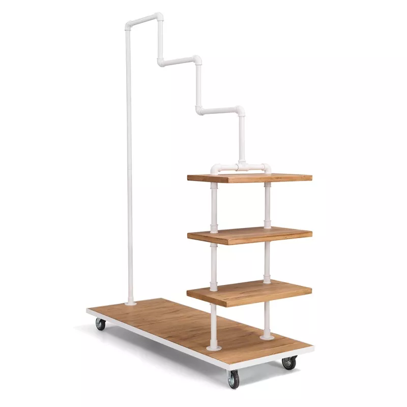 Dank der vier leichtgängigen Rollen ist der Kleiderständer besonders beweglich und flexibel einsetzbar – ideal für moderne Wohnräume oder skandinavisch eingerichtete Zimmer. Die Kombination aus weißen Metallrohren und hellem Holz fügt sich harmonisch in verschiedene Einrichtungsstile ein.