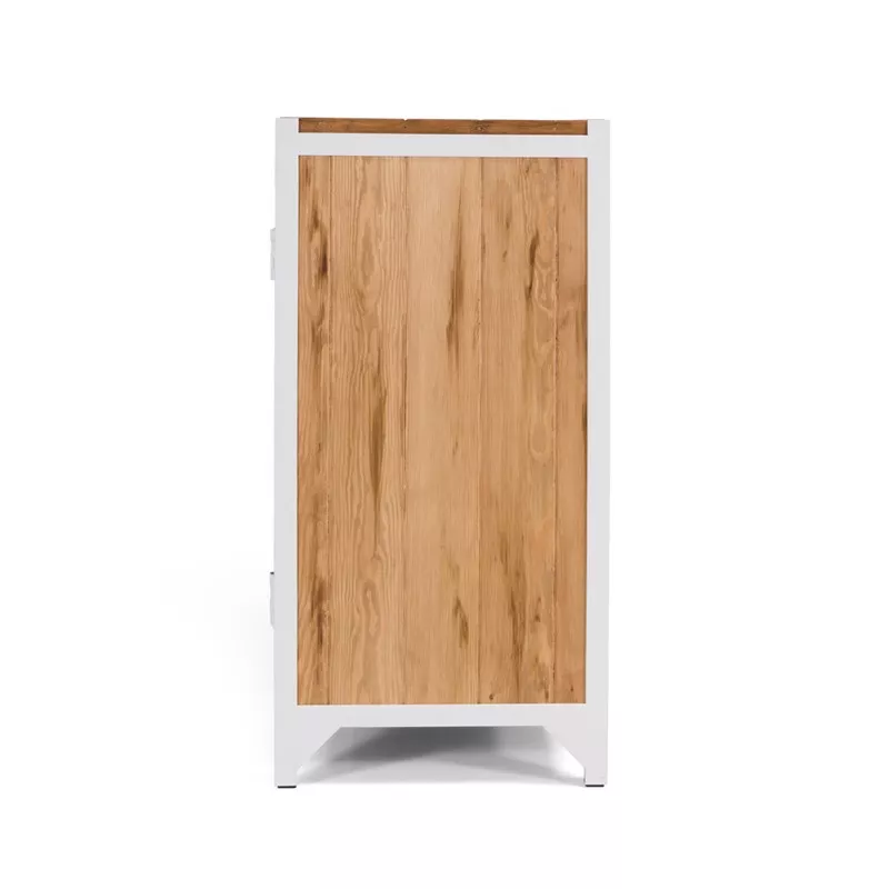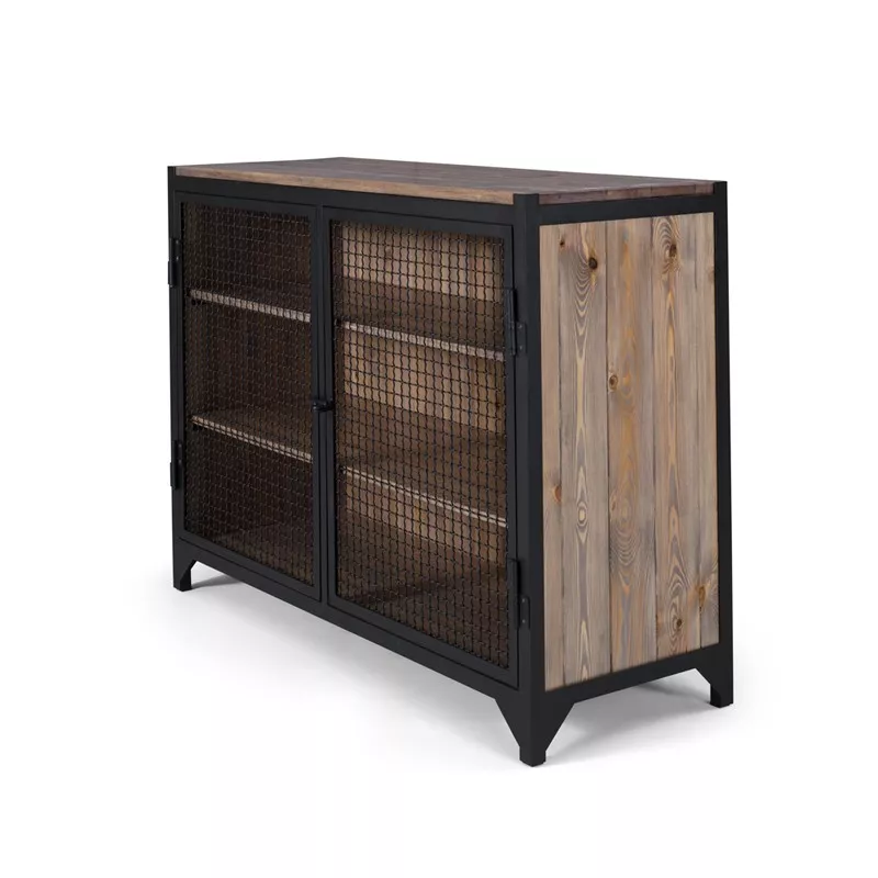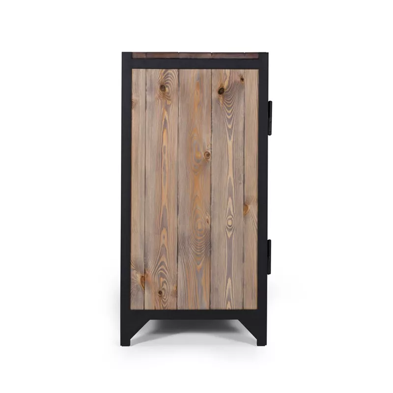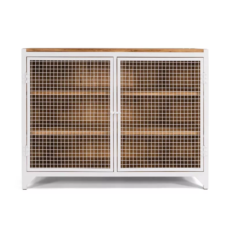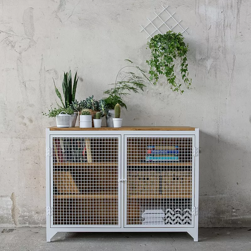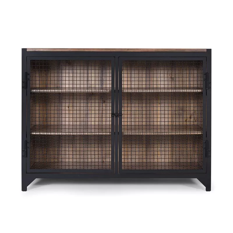 Das robuste Sideboard CLATRI II wird aus Stahl, Wellengitter und Kiefernholz gefertigt. Mit drei Ablagen innen ausgestattet, bietet das Sideboard genügend Platz für alle Kleinigkeiten, die in den jeweiligen Räumen benötigt werden. Das Sideboard in Industrial-Stil ist die perfekte Ergänzung für Ihren Wohnbereich. Es kann mit einem Hängeschloss abgeschlossen werden.