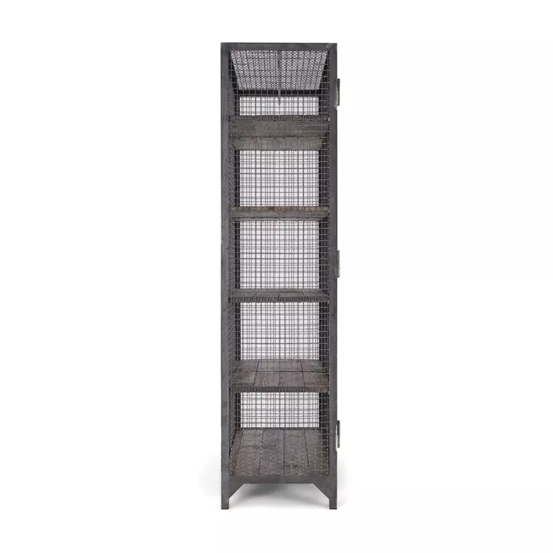 Der Korpus wird aus Stahlwinkeln und solidem Wellengitter in Handarbeit gefertigt. Die Ablageböden aus massivem Kiefernholz sind herausnehmbar, dadurch kann der Multischrank sehr vielseitig eingesetzt werden. Dank der eingebauten Bügelstange kann es als Kleiderschrank genutzt werden. Der Verschlusshebel der Tür lässt sich mit einem Vorhängeschloss sichern.