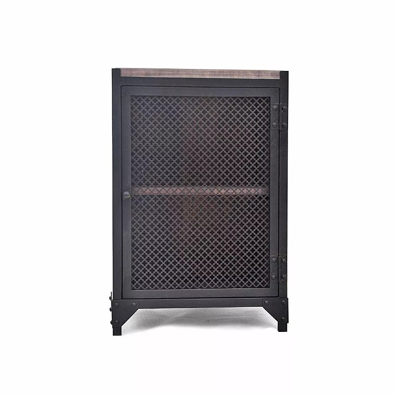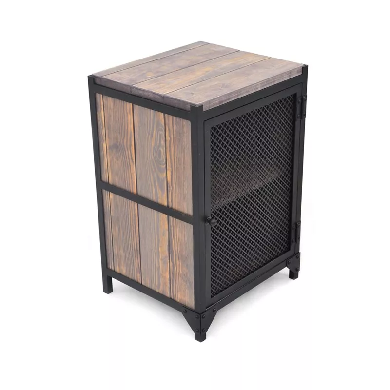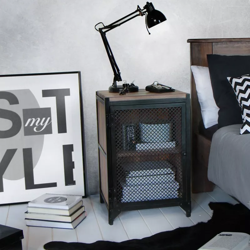 Der robuste Nachtschrank CLOVER R Schwarz ist ein Musterbeispiel für industrial Look: rauer Stahl, wunderschönes Holz und Nieten. In der Türfront wird anstatt einer gewöhnlichen Stahlplatte eine mit Kleeblattmuster eingebaut, was den Nachtschrank zu einem interessanten Blickfang macht. Das eingebaute Holz wird in Grau gebeizt, somit kommt die schöne Maserung des Kiefernholzes richtig zur Geltung.