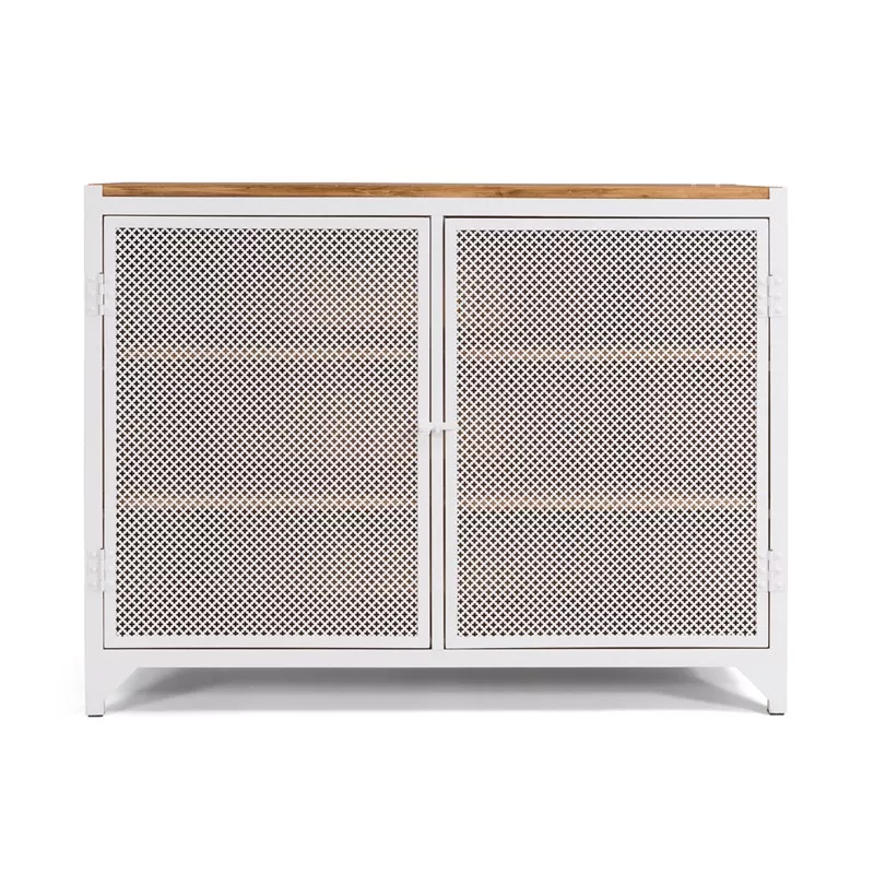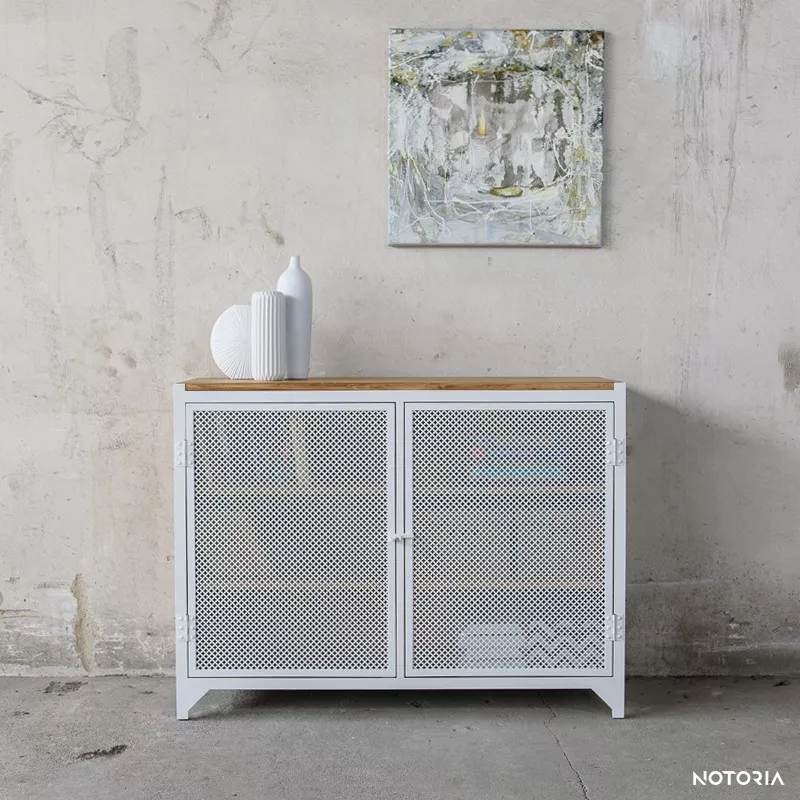 Das robuste Sideboard CLOVER wird aus Stahl und Kiefernholz gefertigt und beeindruckt durch Qualität. Es bietet vielseitige Gestaltungsmöglichkeiten und mit drei Ablagen innen einen zusätzlichen Stauraum in Wohnzimmer, Küche oder Esszimmer. Die doppelflügelige Türen des Sideboards mit dem kleinen Kleeblattmuster wirken sehr dekorativ und nicht überladen.