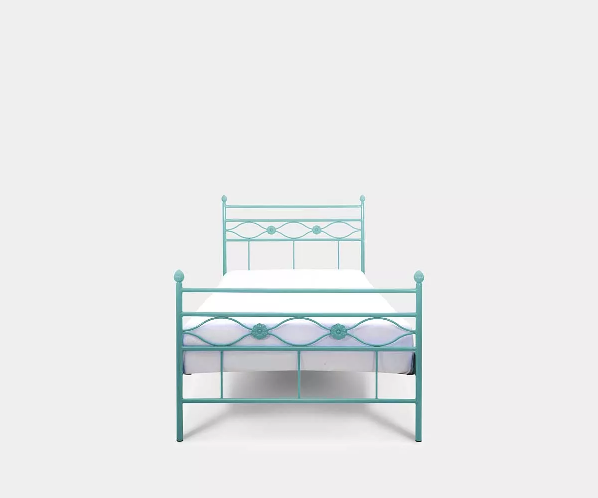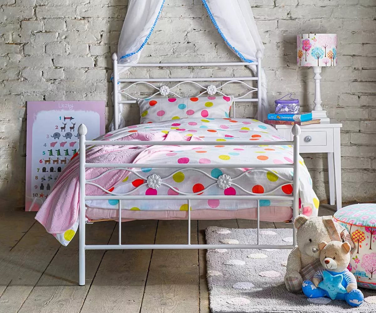 Das märchenhafte Metallbett FLORIS verzaubert in ersten Augenblick und ist ein wahrer Hingucker in jedem Kinderzimmer. Das Kopf- und Fußteil dieses romantischen Metallbettes wurde in liebevoller Handarbeit mit kleinen Blumen verziehrt, was besonders Mädchenherzen höher schlagen lässt.