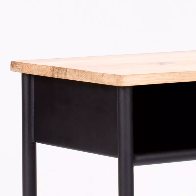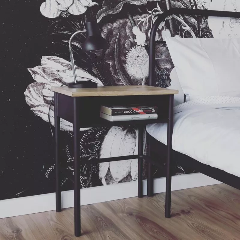 Der aus Stahl und Eichenholz gefertigte Nachttisch HERI II wird in Handarbeit gefertigt und überzeugt mit viel Charme. Der pulverbeschichtete Nachtschrank mit der schönen Tischplatte aus Eiche ist ein wahres Schmuckstück in jedem Schlafzimmer. HERI II wurde passend zu unseren Retro-Metallbetten designt, damit der Schlafzimmer perfekt gestaltet wird.
