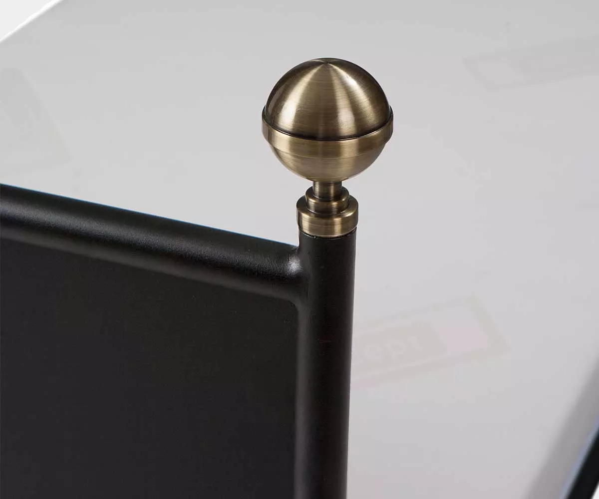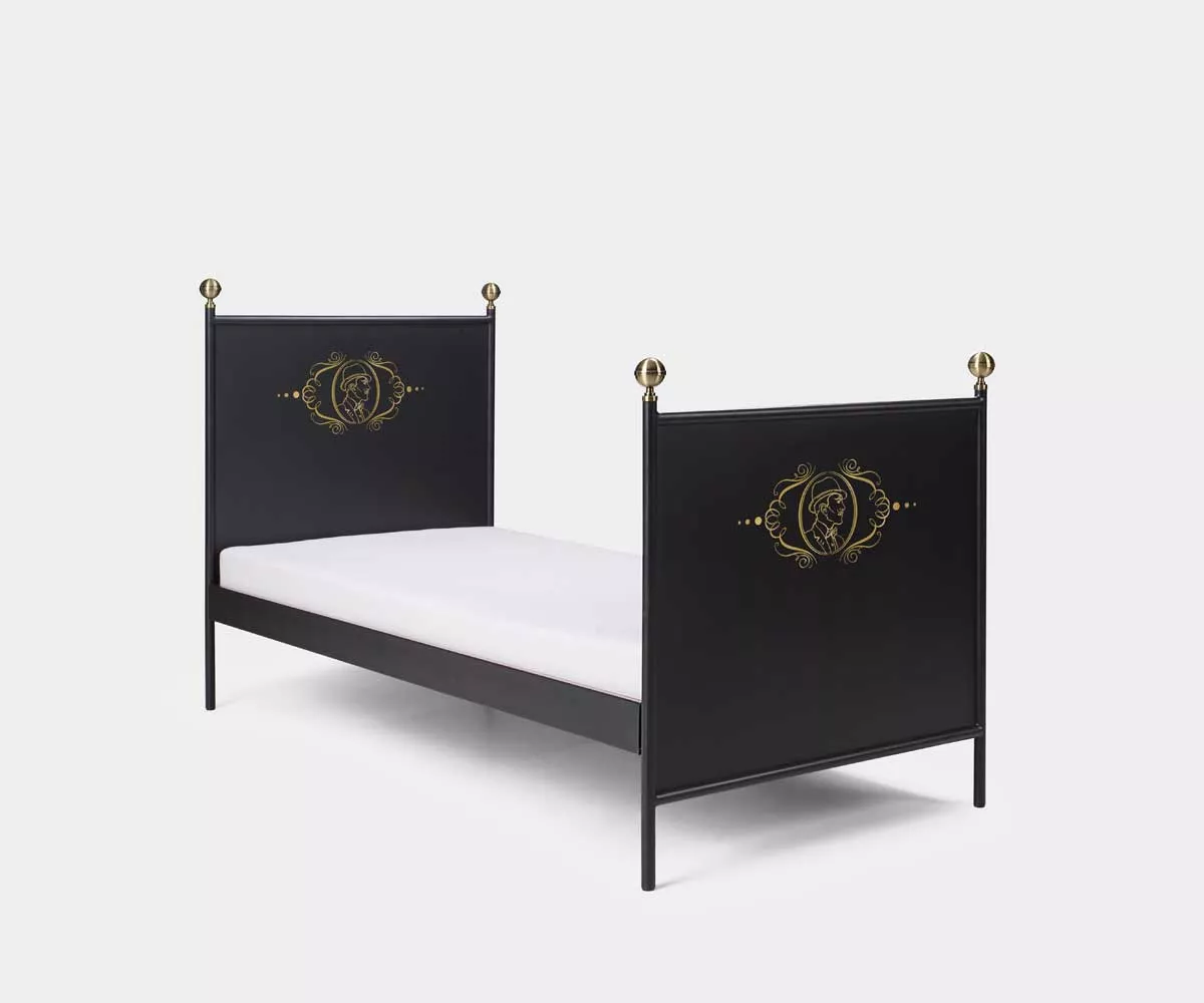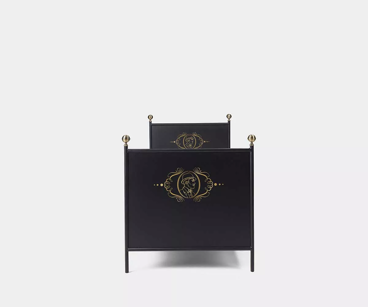 Das Metallbett LAMIN HOMME deren andere Hälfte ❤ das Metallbett LAMIN FEMME ist, verbindet eine klassische Form mit viel Eleganz. Mit schwarzer Strukturfarbe beschichtet und mit eleganten mit Messing beschichteten Kugeln geschmückt strahlt das Bett viel Nostalgie aus. Der in Art Deco Stil abgebildete Mann wird per Hand in goldener Farbe draufgezeichnet und erinnert an die goldenen Zwanziger.