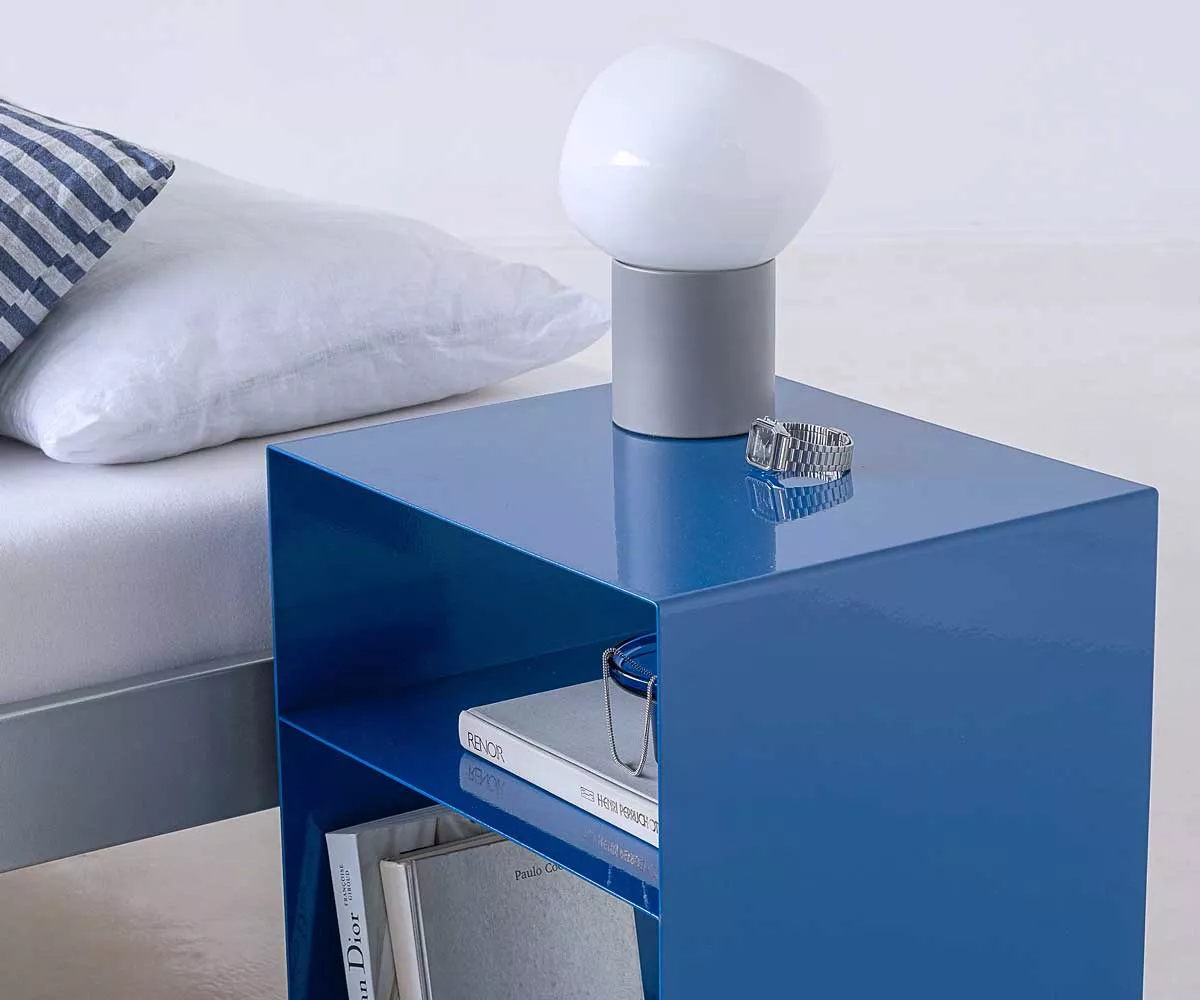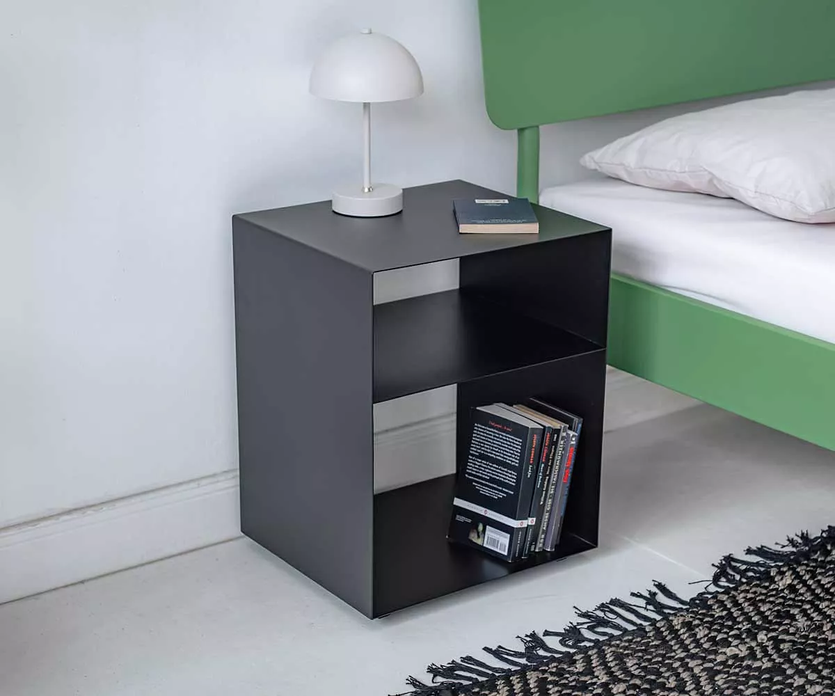 Der moderne Nachttisch LANX wird in Handarbeit aus Stahlblech gefertigt und anschließend pulverbeschichtet. Eine robuste und zeitlose Wahl für das Schlafzimmer.
