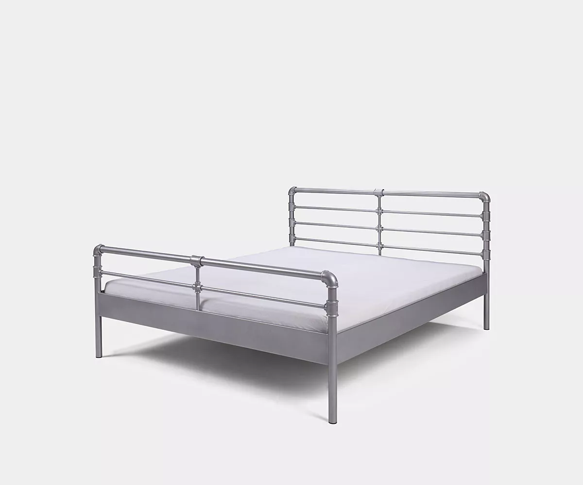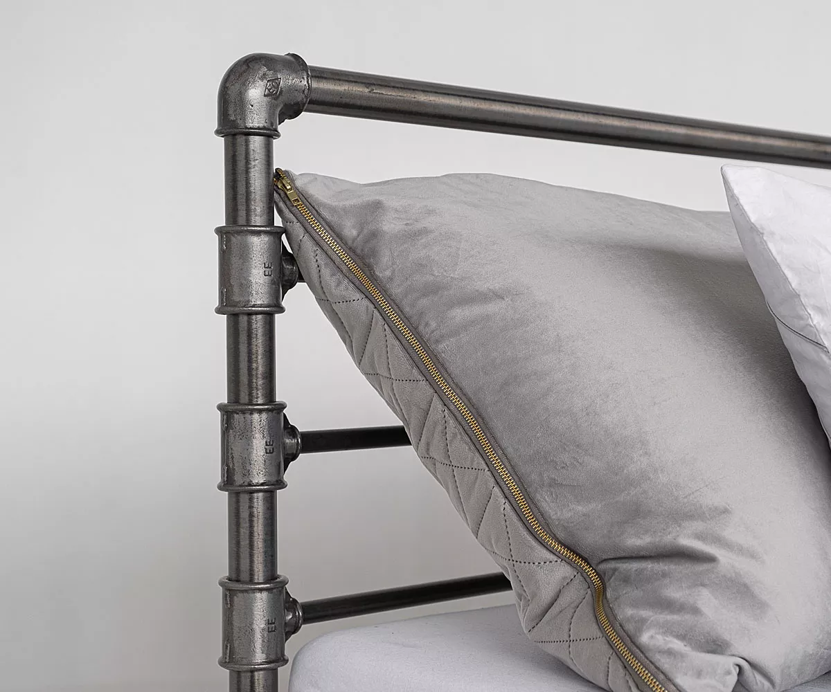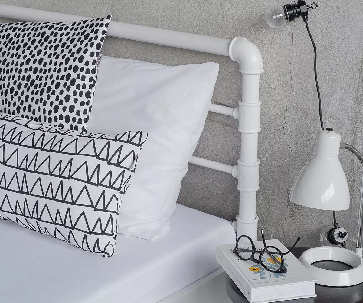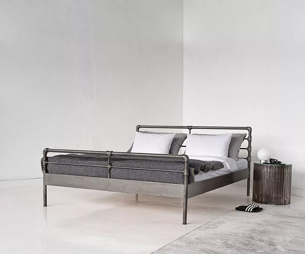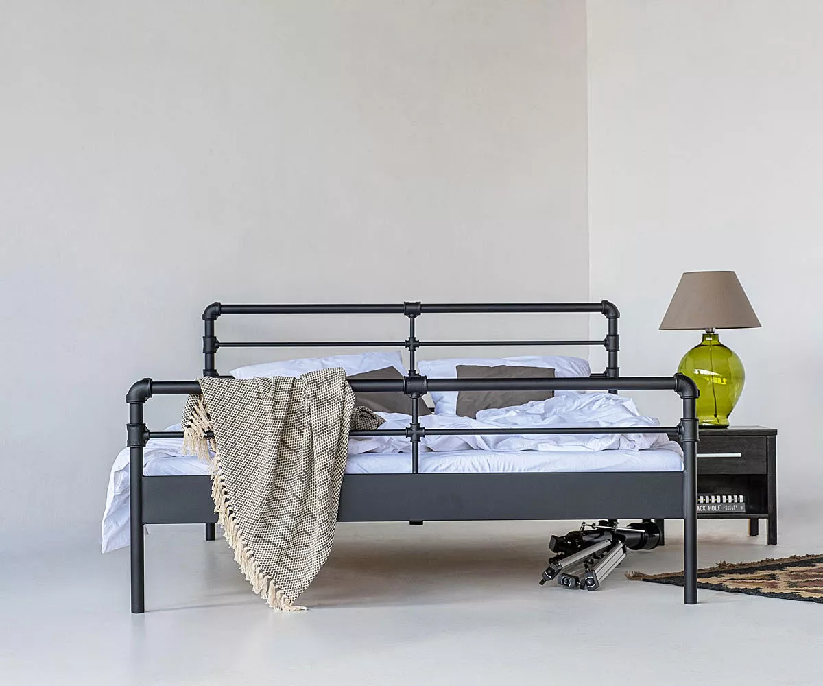 Temperguß-Fittings sagt Dir das was? Wenn Du ein Hobby-Klempner bist dann bestimmt ja und wenn nicht, dann kennst Du wohl Rohrverbundungen.  Dank diesen Rohrverbindungen erhält das Metallbett seinen einzigartigen Industrial-Look. Es ist ein einzigartiges Bett für alle Fans von stylischen Lofts und kultigen Backsteinfabriken, die auf der Suche nach originellen Möbelstücken sind. Das Metallbett kannst Du pulverbeschichtet in vier unterschiedlichen Farbvarianten oder einfach "roh" mit Schleifspuren und Macken, nur mit durchsichtigem Lack gesichert, bestellen.