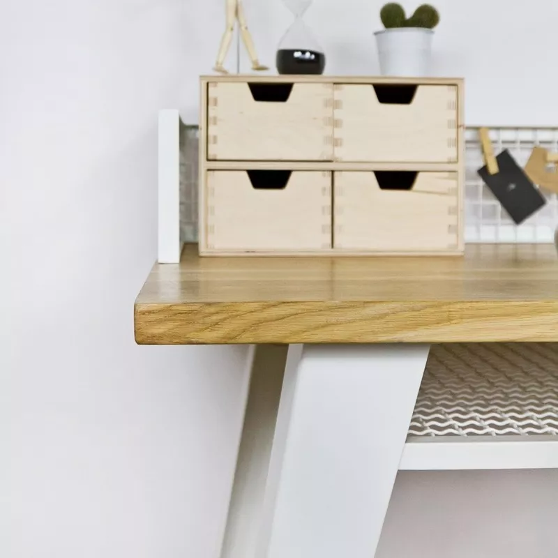 Unter der Arbeitsplatte befindet sich eine praktische Ablage aus schwarzem Wellengitter, die ausreichend Platz für Laptop, Tablet, Tastatur oder andere Arbeitsmaterialien bietet. Die zusätzliche Blende aus Wellengitter sorgt nicht nur für Sichtschutz, sondern verleiht dem Tisch auch von hinten ein stilvolles Erscheinungsbild – ideal für offene Wohnräume, Ateliers oder Homeoffices.
